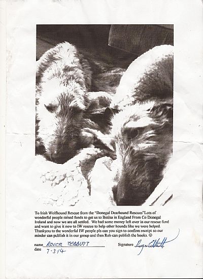The financial side was controlled by an independant person, books available by request a donation of 300£ was made into the fund for mother, also papers were bought from her breeder by me which was an additional 325£ cost. the balance of the fund was donated to Irish Wolfhound Rescue as it was mainly Wolfhound people who contributed and they run a fantastic rescue!. the balance given was 100£