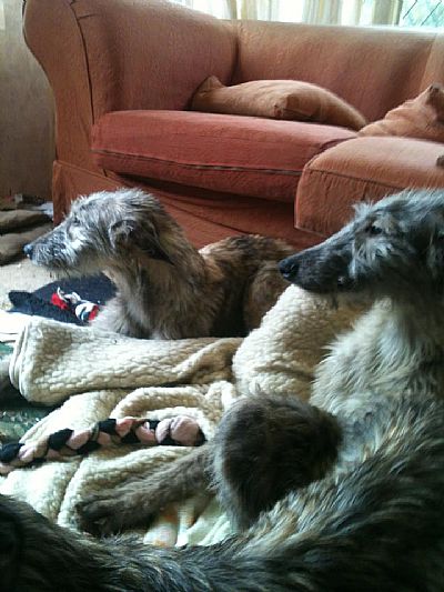 I rescued a beautiful Deerhound mother and her puppies from Ireland. The puppies were very thin and I was very concerned as to their future, I am happy to say having spent 3 months here with me they are all now in their new loving homes. I called them my " Donegal Dear Hounds" as they are from Co Donegal and very dear to the 30 people who raised the funds to get them here to me. Mother was found to be purebred and KC registered Deerhound. a friend was visiting from Ireland and scanned mum, some 3 weeks after arrival we found a chip!, she was IKC registered Deerhound please click on link below to see photo's of the "Donegal Dear Hound Wairns" :-)